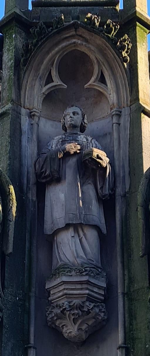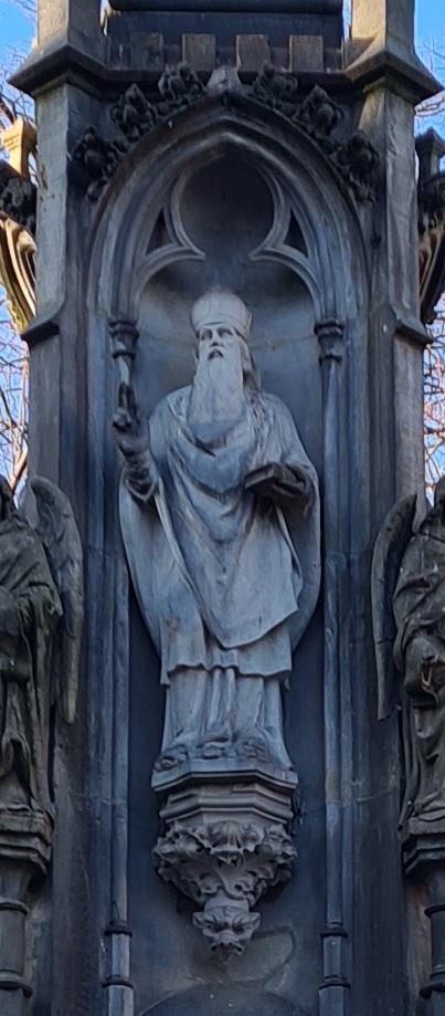 Seitlich der Heiligenfigur zwei der vier 1909 angebrachten Engel an der Mariensäule.