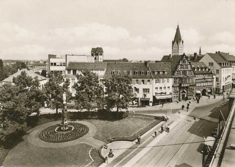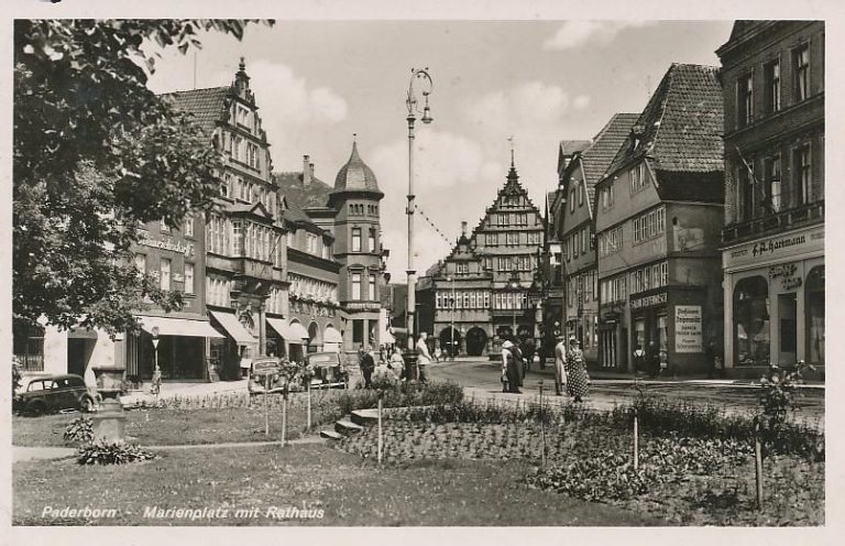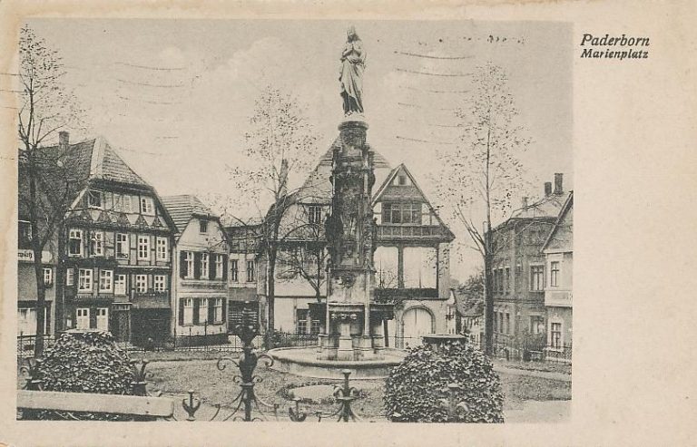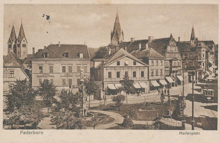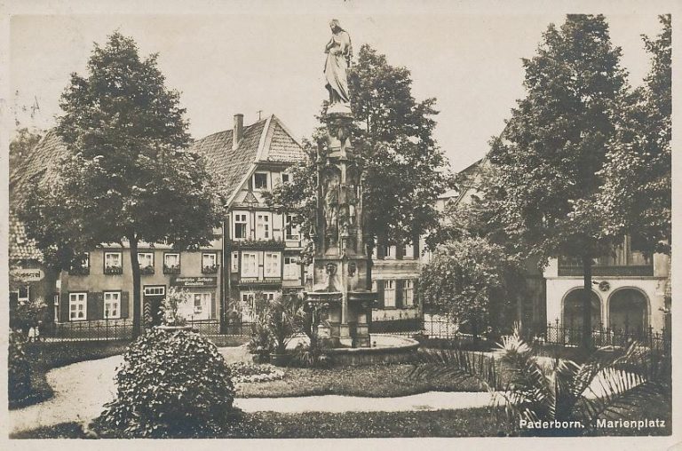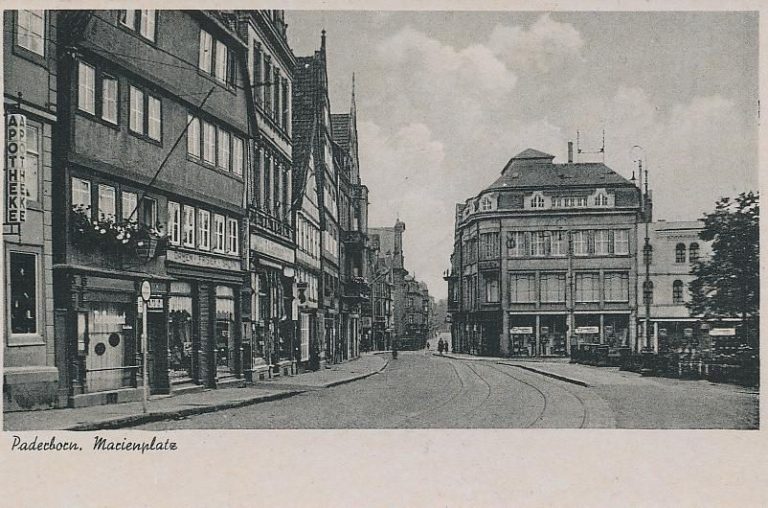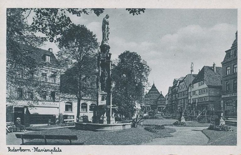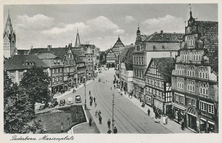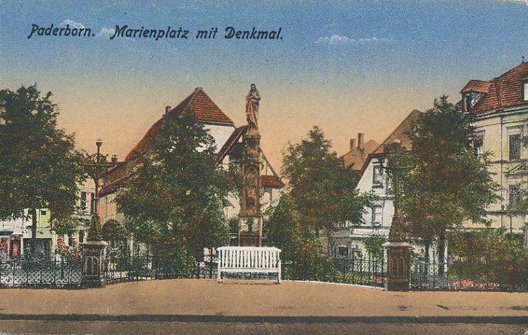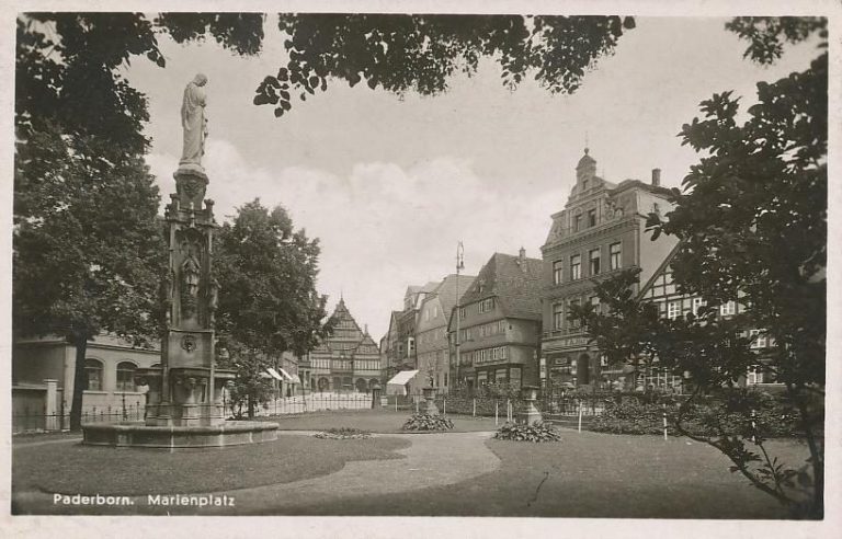 Der Marienplatz, heute im Zentrum der Altstadt Paderborns gelegen, hat sich seit seiner Anlage und Bepflanzung zu einem Ort des Innehaltens entwickelt. An Sommertagen bietet er im Schatten der Bäume die Möglichkeit, in angenehmer Gesellschaft ein erfrischendes Eis zu genießen. Häufig werde ich auf die, vielen Mitmenschen verständlicherweise nicht bekannte Vergangenheit des Platzes angesprochen. Da der Marienplatz für fast siebzig Jahre auch die Heimat der Werkstätten Bernard Stadler war, möchte ich ihm an dieser Stelle etwas Raum geben, um die wechselvollen Zeiten in kurzen Punkten zu beleuchten und anhand des mir vorliegenden Bildmaterials die jüngere Vergangenheit für den Interessierten erfahrbar und nachvollziehbar zu machen. Viele dieser Punkte sind eine enorme Hilfe zur genaueren oder ergänzenden Datierung des Bildmaterials.