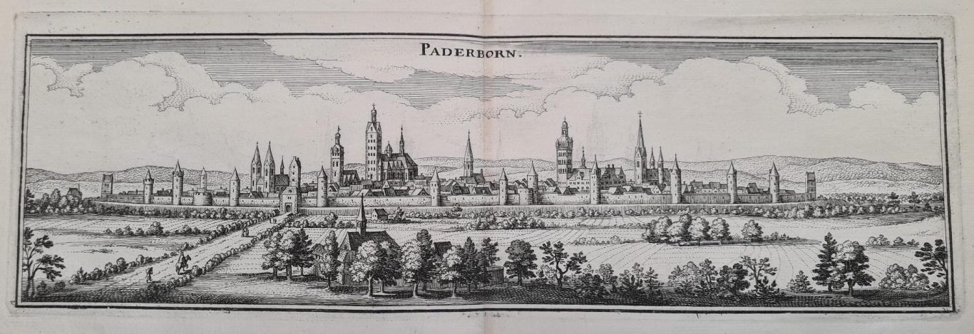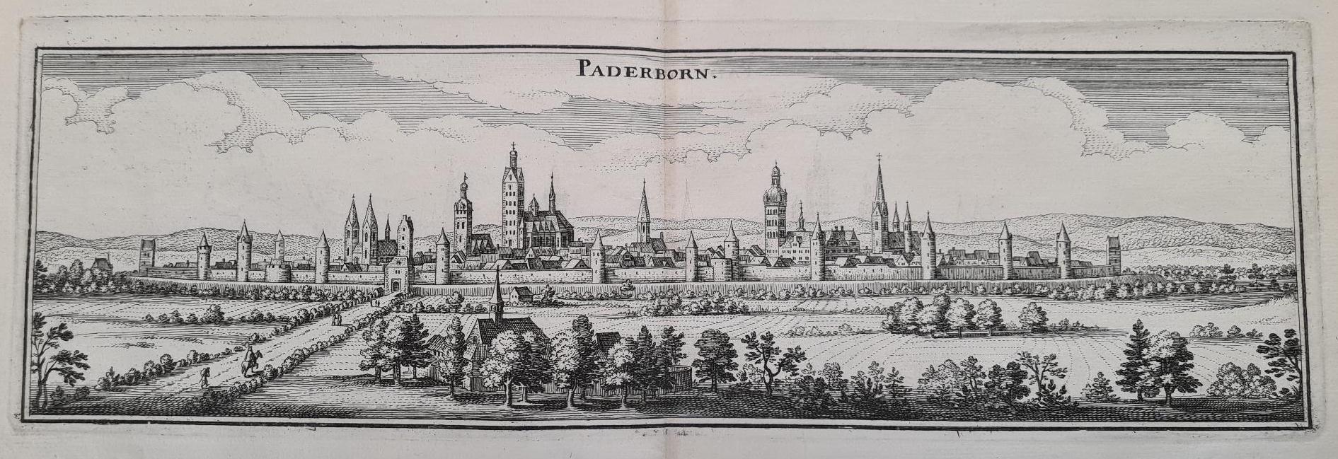 Die älteste erhaltene Ansicht der Stadt Paderborn. Kupferstich von Matthäus Merian des Älteren (1593 - 1650) aus der Topographia Westphaliae 1647.