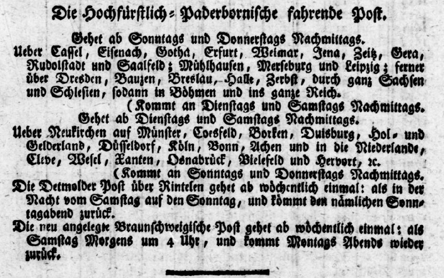 Die Verbindungen der „Hochfürstlich-paderbornische fahrende Post“ ab/an Paderborn per 1792.