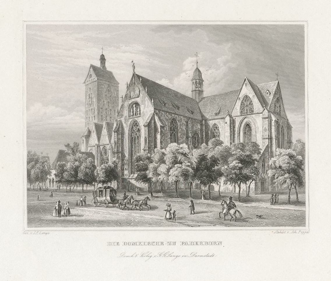 Der Dom zu Paderborn nach einem Stahlstich von Johann Poppel nach J.F. Lange aus dem Jahre 1840. Davor sieht man die Postkutsche, wie sie auch zu Goethes Zeiten fuhr.