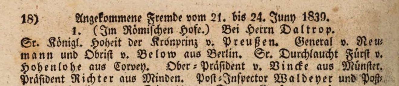 22. Juni 1839: Der preußische Kronprinz Friedrich Wilhelm (regierte ab 1840 als König Friedrich Wilhelm IV von Preußen) logiert ein zweites Mal mit Gefolge am Kettenplatz B 223/Marienplatz 12, bei Herrn Daltrop im „Römischen Hofe“ während seines Aufenthalts in Paderborn. Paderborn feiert die Anwesenheit des Kronprinzen mit einer Illumination der Stadt. Seine beiden vorherigen Besuche in Paderborn erinnert König Friedrich Wilhelm IV bei seiner Rede in Paderborn am 21. Juli 1853 anläßlich der Einweihung der Bahnstrecke Paderborn - Warburg.