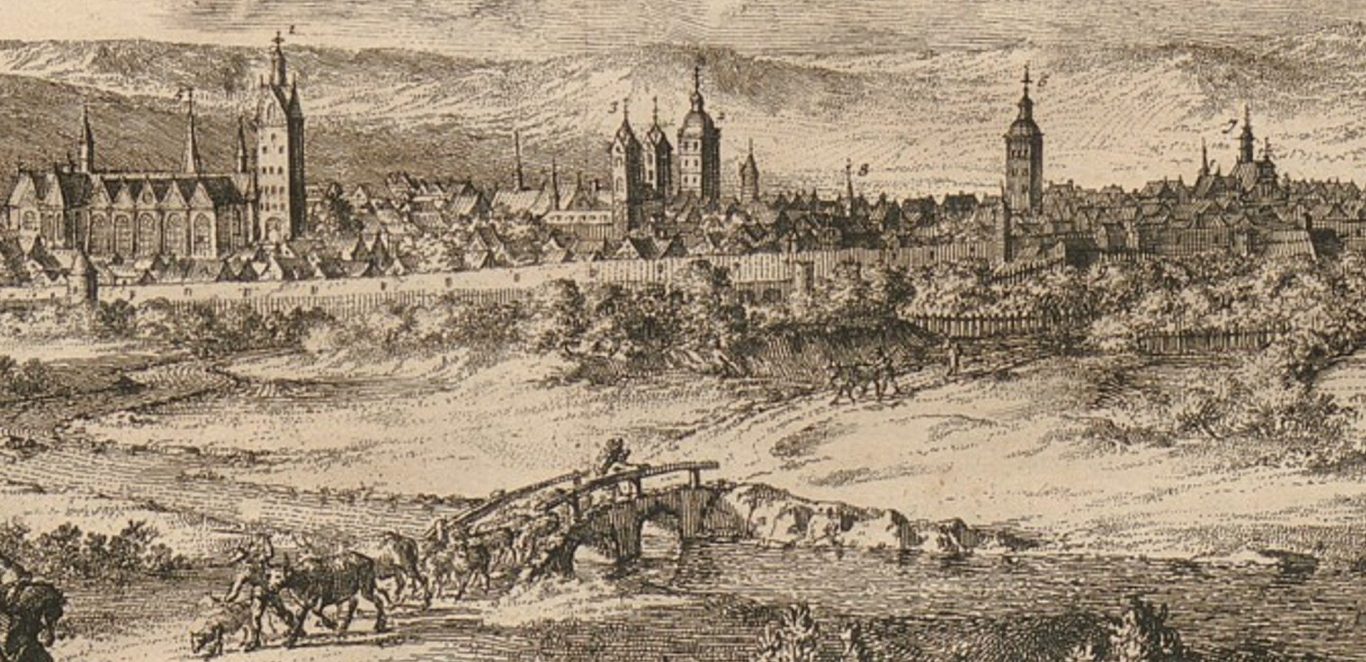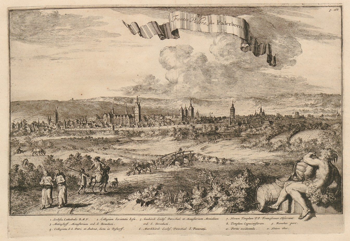Ansicht der Stadt Paderborn von Norden. Kupferstich von Johann Georg Rudolphi (1633 - 1693) aus der Monumenta Paderbornensia