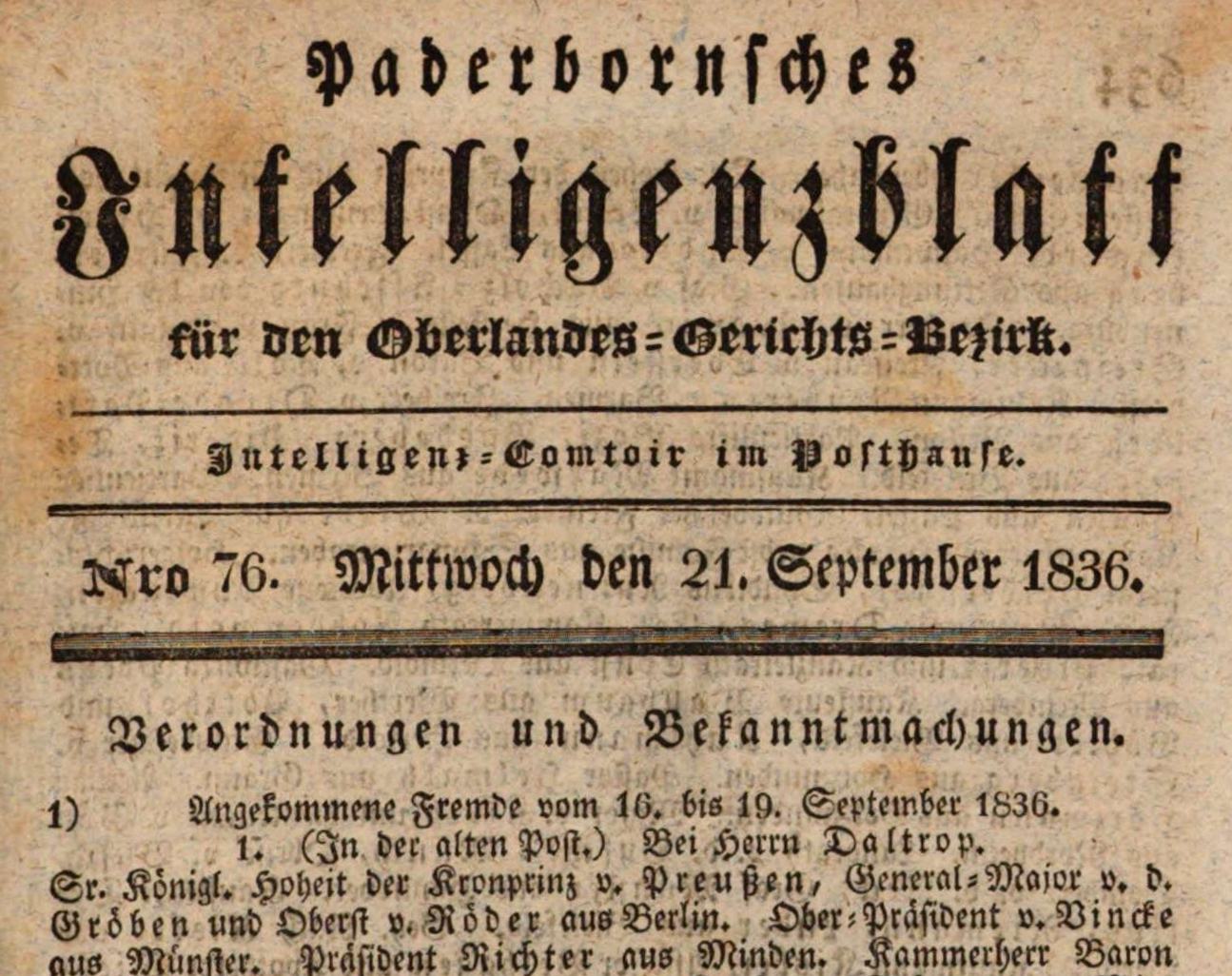 19. September 1836: Der preußische Kronprinz Friedrich Wilhelm (regierte ab 1840 als König Friedrich Wilhelm IV von Preußen) logiert mit Gefolge am Kettenplatz B 223/Marienplatz 12, in der alten Post bei Herrn Daltrop (ab Januar 1837 dann „Zum Römischen Hofe“ genannt) während seines Aufenthalts in Paderborn anläßlich eines Manövers.