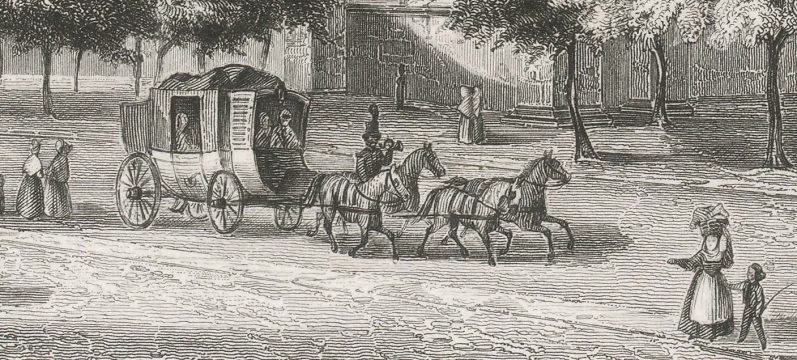 Die vierspännige Paderborner Postkutsche, Ausschnitt aus dem Stahlstich unten von 1840.