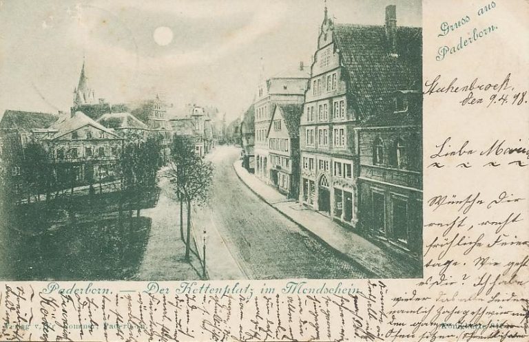 Paderborn, Kettenplatz, auf einer frühen Lithografie-Ansichtskarte, offensichtlich nach dem obigen Foto von 1896 gezeichnet.