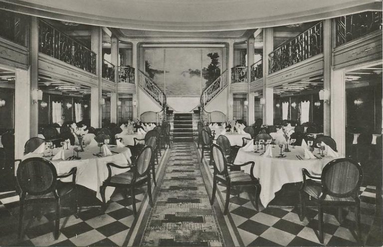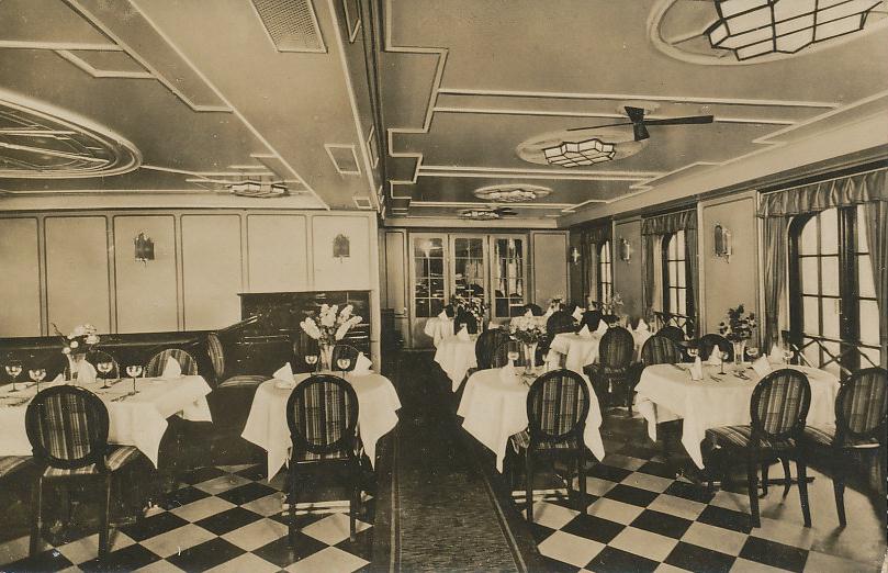 Speisesaal des niederländischen Rheindampfers JULIANA, PRINSES DER NEDERLANDEN (1928), ausgeführt durch die Werkstätten Bernard Stadler.