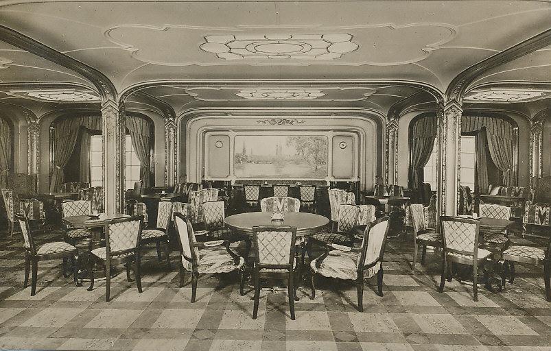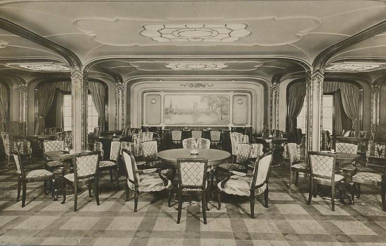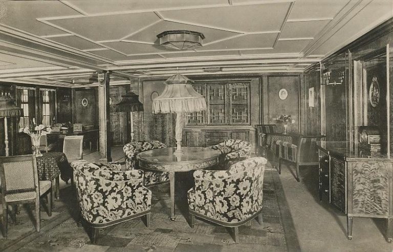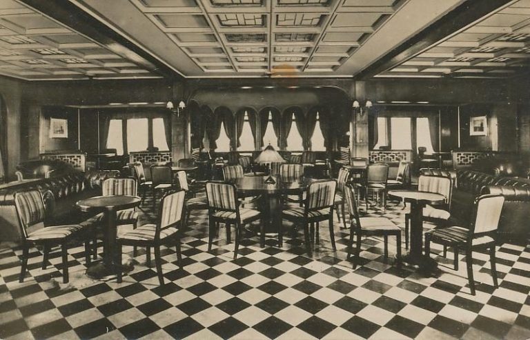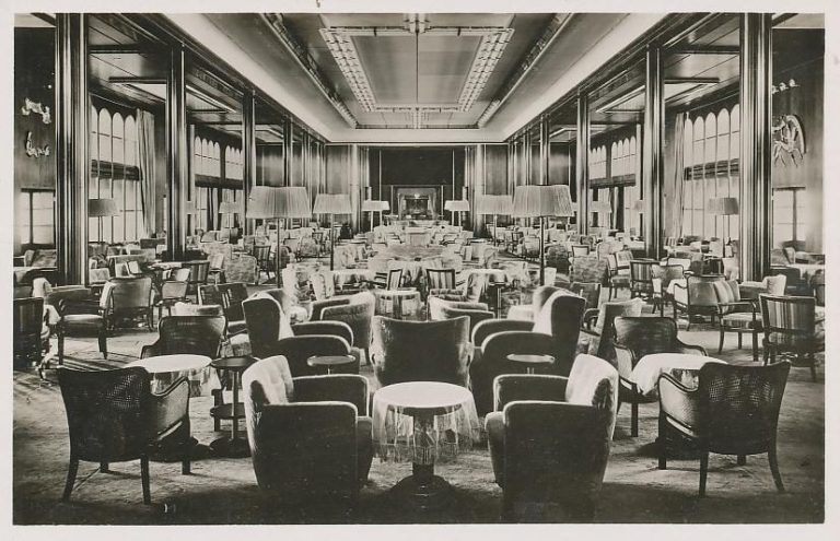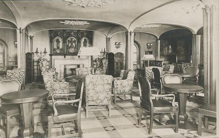 Eine Innenansicht des Rheindampfers VATERLAND (1926), dessen Einrichtung komplett durch die Werkstätten Bernard Stadler ausgeführt worden ist.